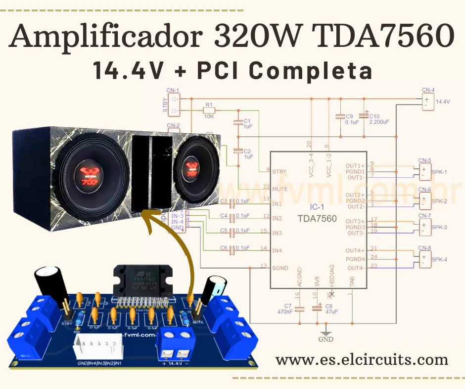 Hoy vamos a explorar un circuito amplificador que desafía la relación tamaño-potencia. ¡Prepárate para construir un amplificador de audio de 320W utilizando el CI TDA7560, capaz de ofrecer una experiencia de sonido impresionante con solo 14.4V de alimentación!