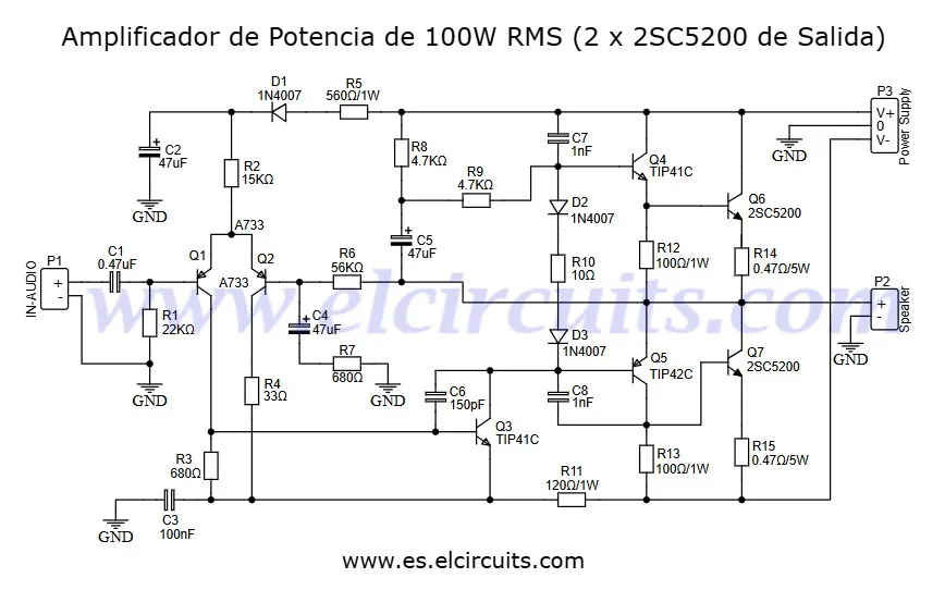 Fig. 2 – Diagrama Esquemático Completo: Amplificador de Potencia 100W RMS con 2 Transistores NPN 2SC5200 en la Salida