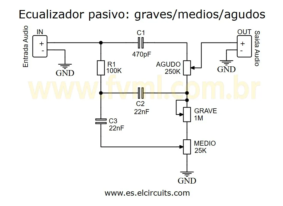 Un ecualizador de 3 bandas (Graves, Medios, Agudos) se inserta en la etapa de entrada del audio. La arquitectura clásica utilizada aquí se basa en un circuito pasivo de bajo ruido. El secreto aquí no es solo agregar control, sino agregar control sin agregar ruido.