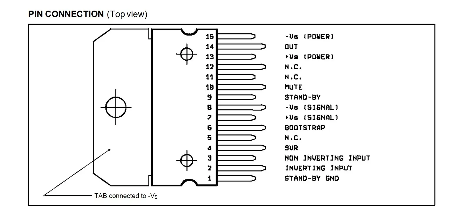 Fig. 2 – El TDA7294 en su encapsulado Multiwatt (vista superior y pinout). Observe el disipador central, vital para la gestión térmica.