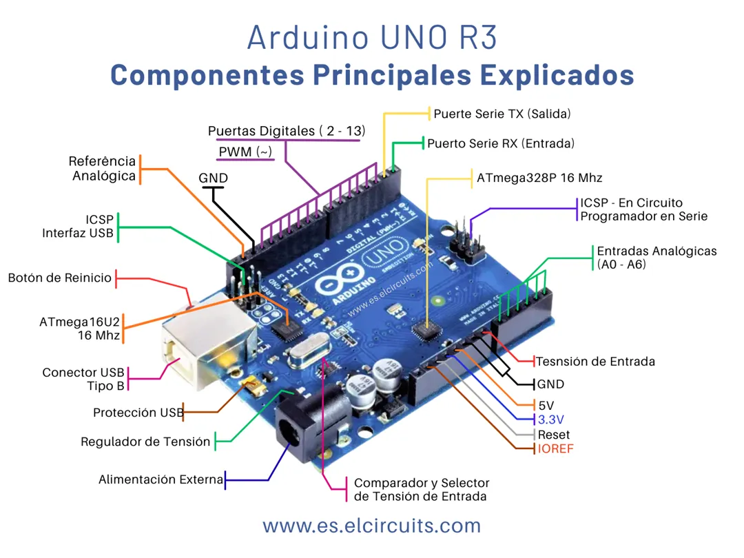 - Microcontrolador: "Cerebro" de la placa, responsable de ejecutar comandos (ej: ATMega328P en el Arduino Uno).