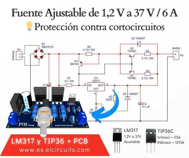 Fuente de Alimentación Ajustable 1.2V a 37V / 20A – LM317 y TIP35C + PCB | Guía Completa