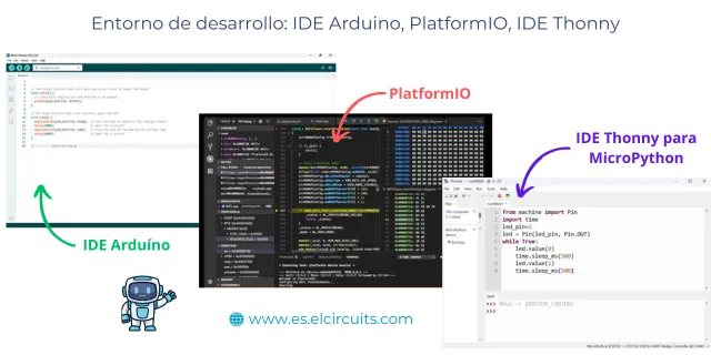 IDE de Arduino (izquierda), PlatformIO (centro) y Thonny para MicroPython (derecha)