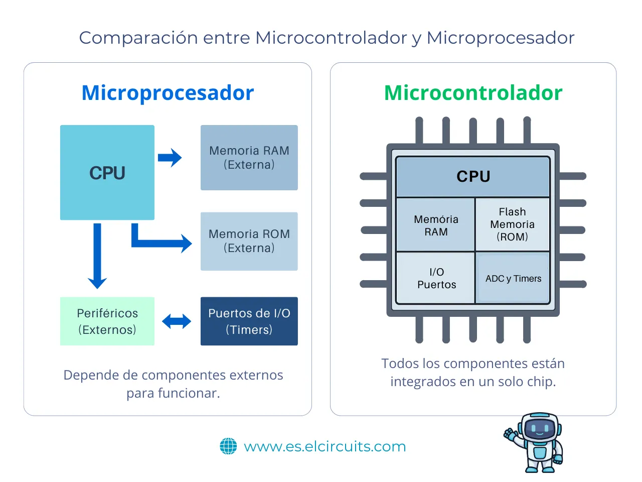 Mientras que los microcontroladores poseen memoria y periféricos integrados (como ADCs y GPIOs), los microprocesadores dependen de componentes externos. Es por eso que los microcontroladores son ideales para proyectos embebidos e IoT.