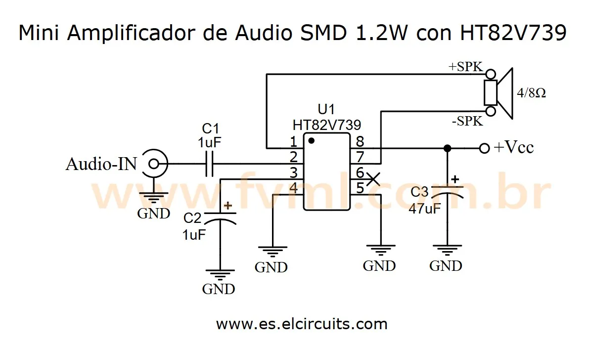 La belleza del mini amplificador con HT82V739 está en su simplicidad. Como se mencionó anteriormente, el circuito completo requiere solo cuatro componentes externos. Analicemos el diagrama esquemático en detalle: