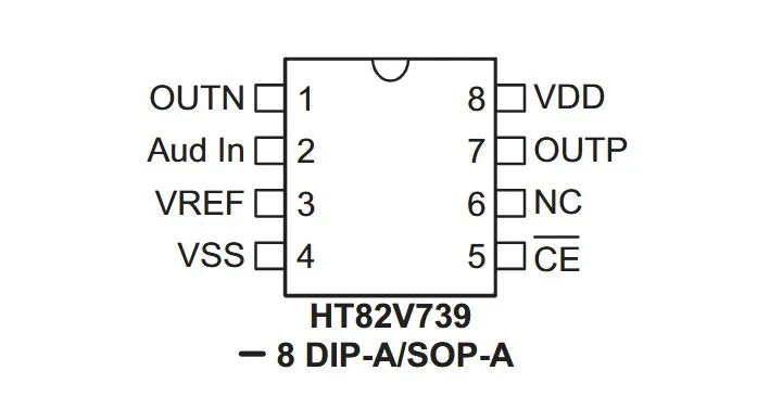 El HT82V739 es un circuito integrado driver de audio de clase AB encapsulado en un paquete de 8 pines (DIP o SOP), diseñado específicamente para aplicaciones que requieren alta calidad de sonido con bajo consumo de energía. Lo que lo hace particularmente interesante para proyectos de audio es su capacidad de entregar hasta 1200mW RMS en una carga de 8 ohmios con menos del 1% de distorsión armónica total (THD+N), operando con tensiones entre 2.2V y 5.5V.